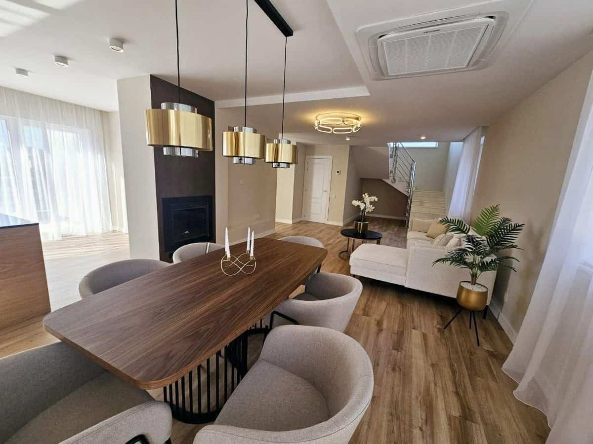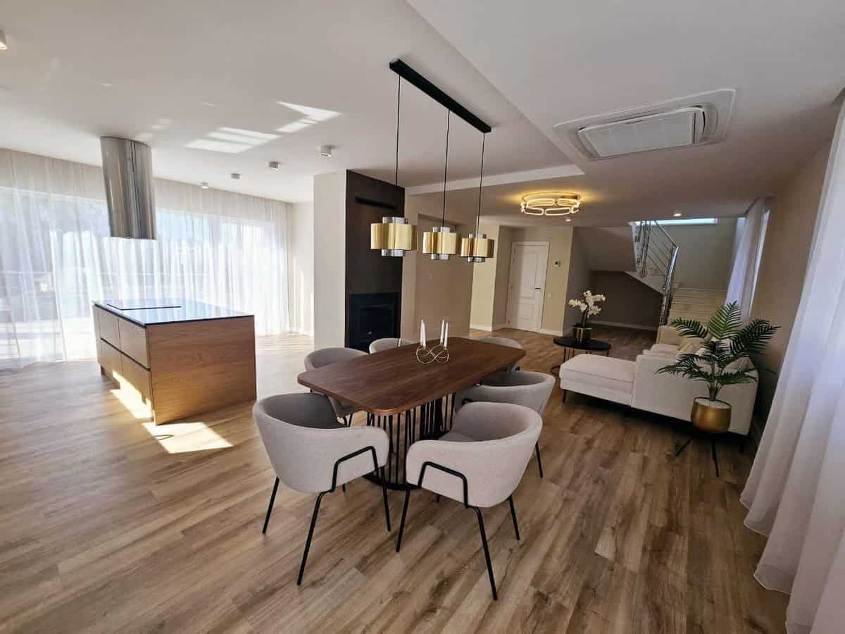 Die Villa verfügt über eine bebaute Fläche von 220 m² und wurde innen wie außen umfassend renoviert. Im Erdgeschoss befinden sich ein Schlafzimmer, ein Badezimmer sowie ein großzügiger Wohn- und Essbereich mit offener Küche. Die Küche ist komplett ausgestattet und bietet hochwertige Geräte sowie elegante Details.