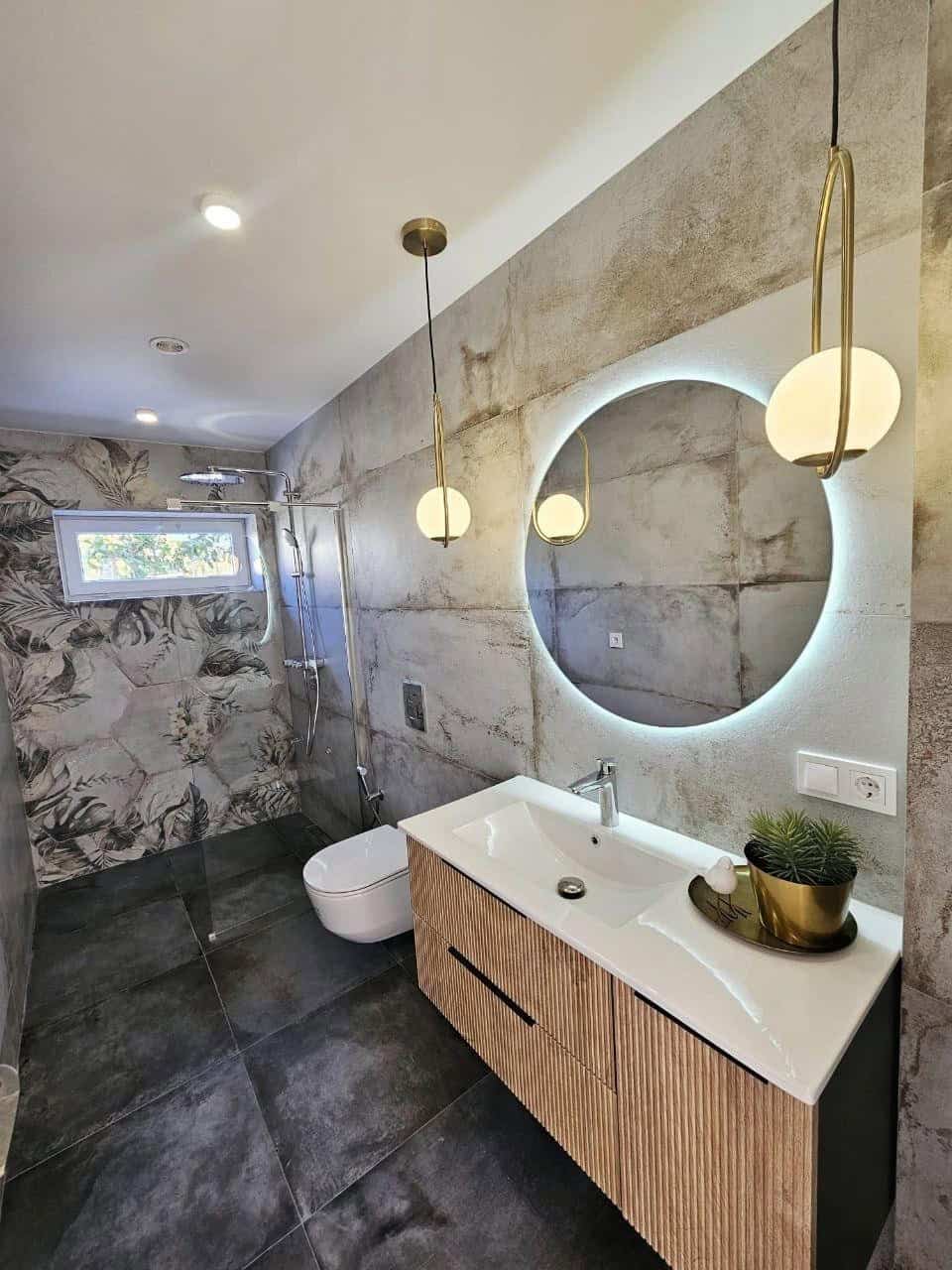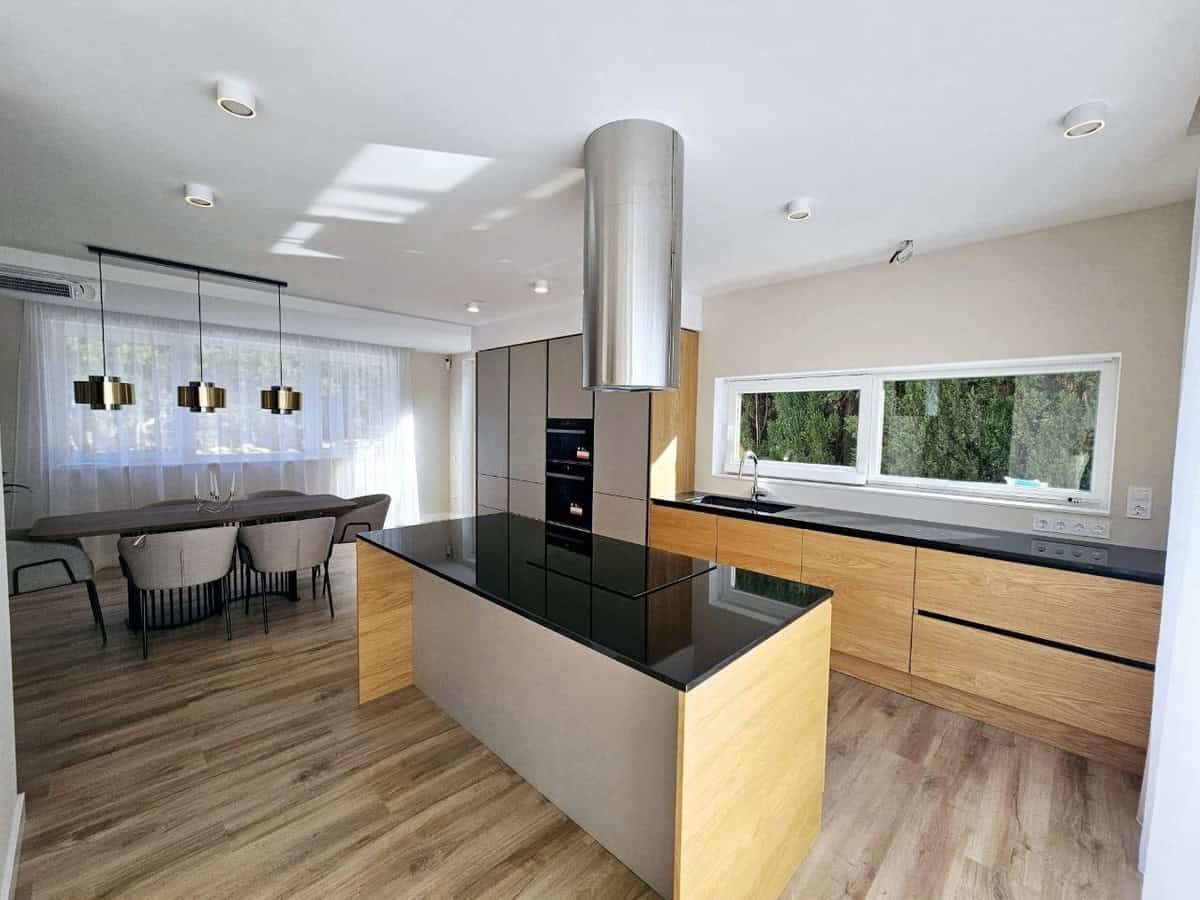 The villa has a built area of 220 m² and has been thoroughly renovated inside and out. The main floor includes a bedroom, a bathroom, and a spacious living-dining room with an open-plan kitchen. The kitchen is fully equipped with high-quality appliances and refined design details.