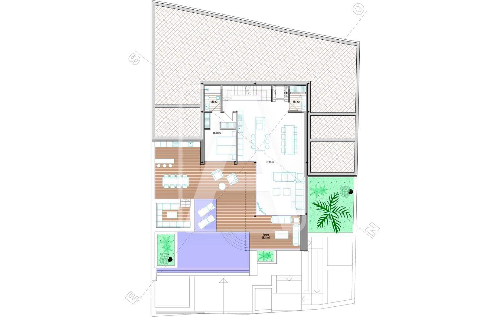 Das Grundstück ist über 600 m² groß und bietet Terrassen, die an den Wohnbereich anschließen. Im Außenbereich befinden sich ein Infinity-Pool sowie ein separater BBQ-Bereich. Parkmöglichkeiten gibt es in der Doppelgarage.