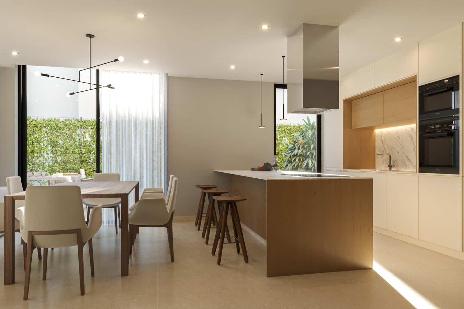 Las villas tienen un diseño contemporáneo y se adaptan al terreno ondulado, creando terrazas privadas con vistas singulares. En el interior, el concepto de espacios abiertos aporta amplitud y confort.