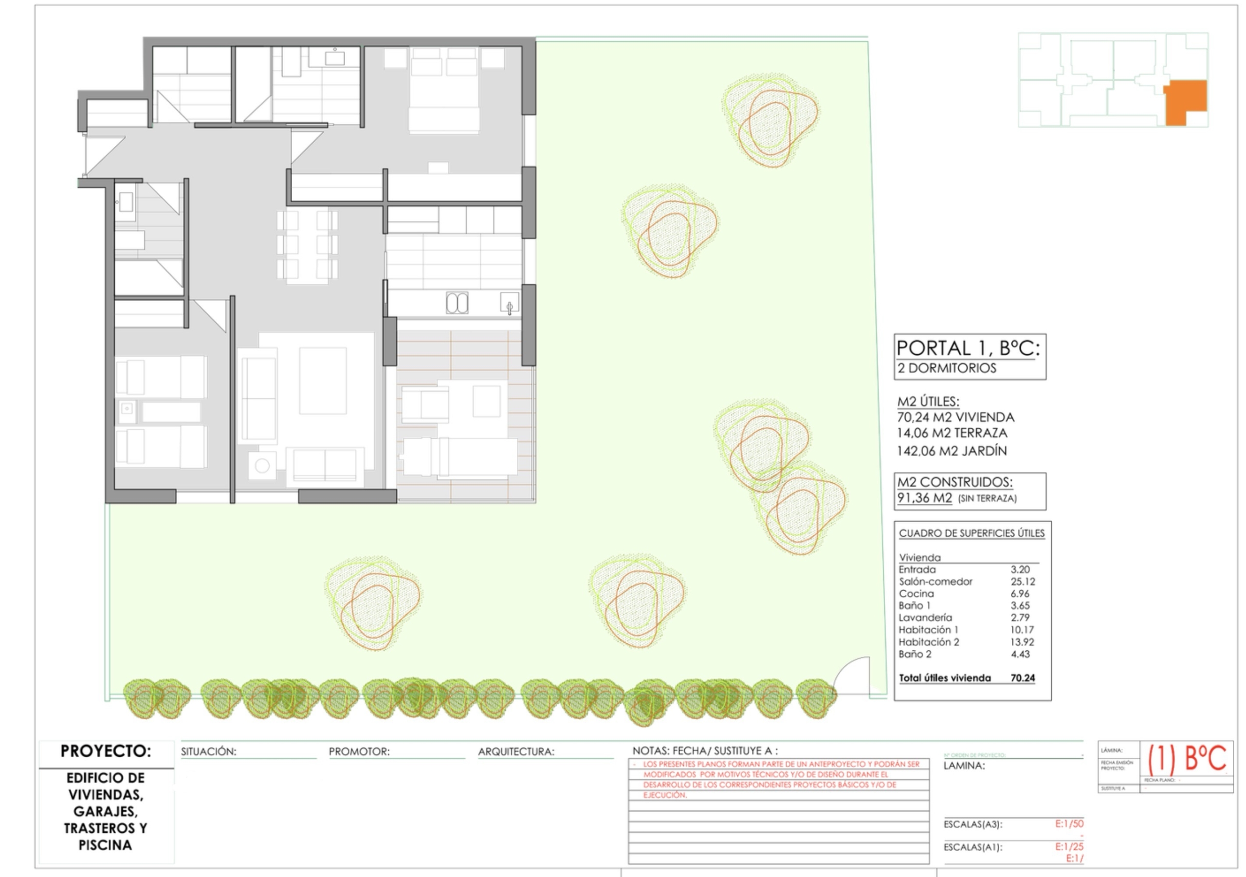 Die Wohnung verfügt über eine bebaute Fläche von ca. 105 m² und ist Teil eines Projekts mit unterschiedlichen Wohnungstypen innerhalb derselben Anlage. Zur Aufteilung gehören 2 Schlafzimmer und 2 Badezimmer, praktisch gestaltet für den Alltag.