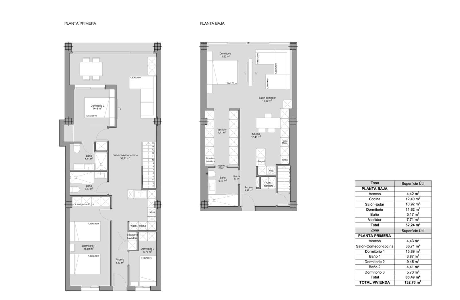 El apartamento tiene una superficie construida de aproximadamente 152 m² y se distribuye en dos plantas. En la planta superior hay un amplio salón-comedor con cocina moderna de concepto abierto, tres dormitorios y dos baños. La planta inferior alberga un estudio con salón-comedor y cocina abierta, un dormitorio doble con vestidor y un baño amplio.