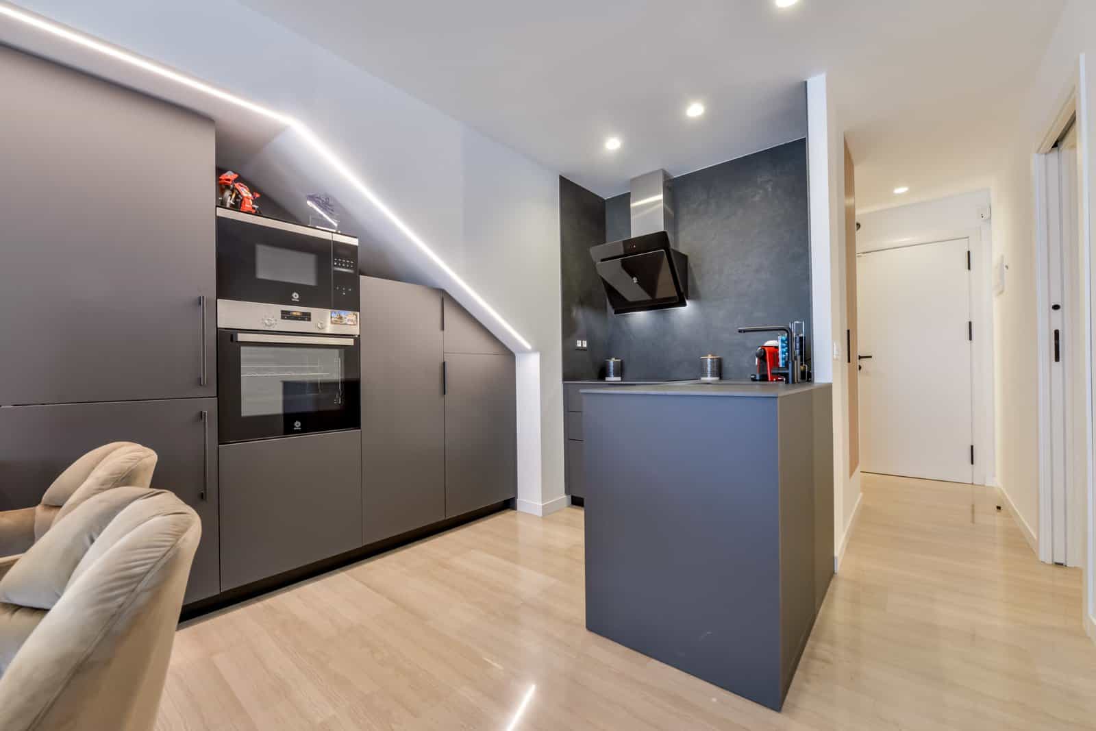 La vivienda ofrece un estilo moderno y cuidado, con cocina abierta contemporánea y una distribución práctica en dos niveles. El estudio aporta flexibilidad como espacio de vida independiente dentro del apartamento.