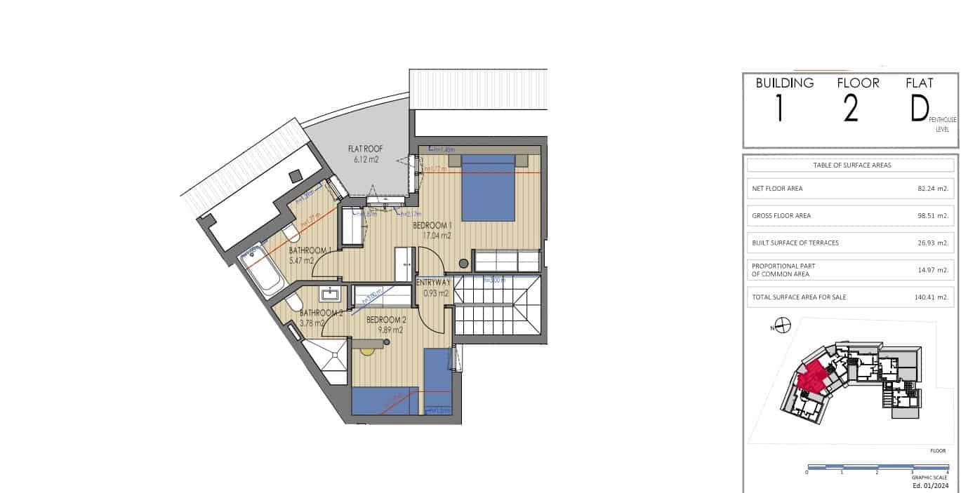 This duplex penthouse is arranged over two floors. The main level features the living-dining room, the open-plan kitchen and a guest toilet. A generous terrace, partly covered, extends from this level, and there is also a separate laundry room.