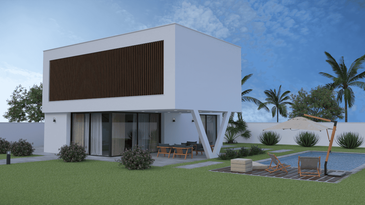 La parcela es de aproximadamente 700 m² y la villa tiene orientación sur para una excelente entrada de luz. Dispone de piscina privada y varias terrazas y pérgolas. El aparcamiento se resuelve con una zona pavimentada dentro de la parcela. El jardín ajardinado es opcional y no está incluido en el precio estándar, lo que permite diseñar el exterior según preferencias.