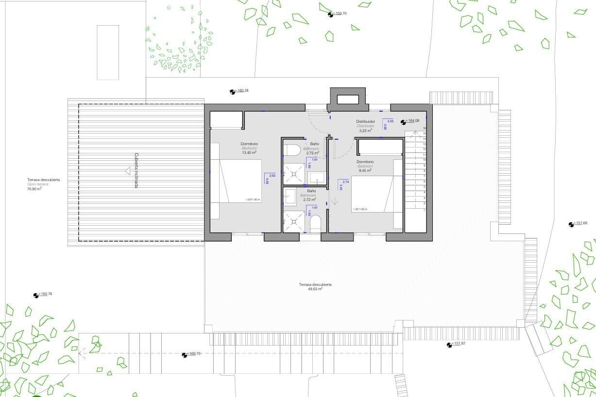 La planta superior cuenta con dos dormitorios dobles, ambos con baño en suite y acceso directo a un gran balcón.