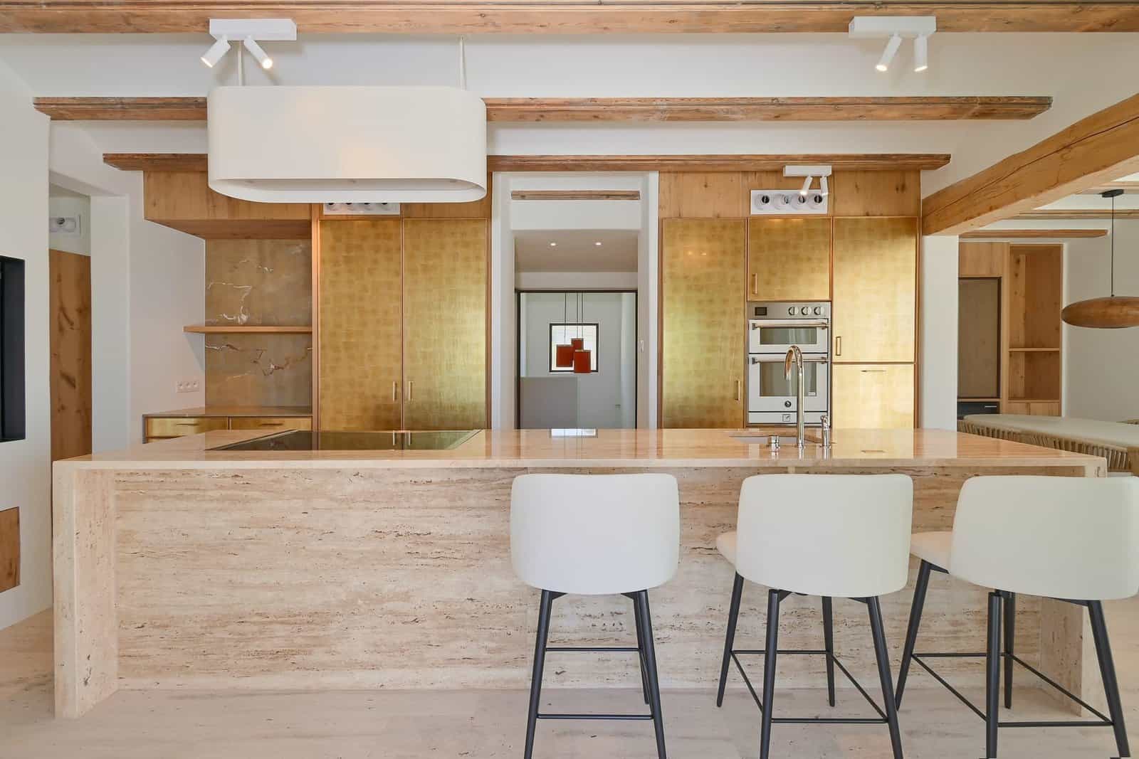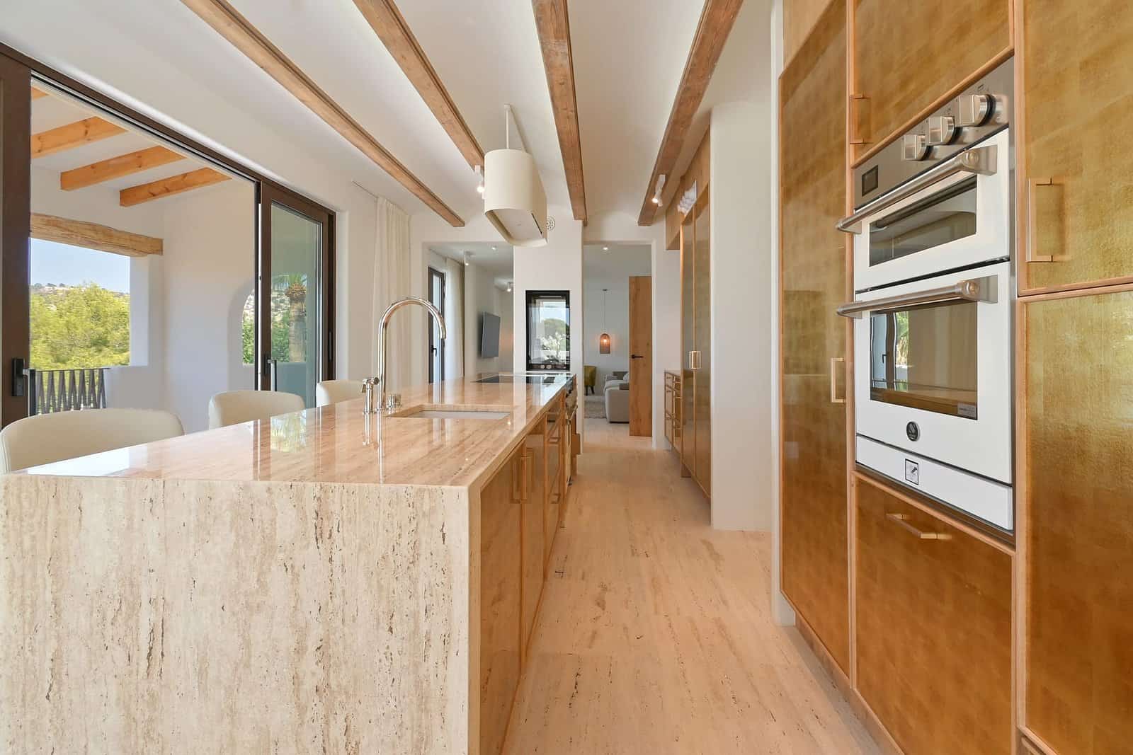 At the heart of the home is a beautifully designed, fully fitted kitchen that blends functionality with timeless elegance. Featuring luxurious travertine countertops in combination with a forgotten Spanish marble and state-of-the-art appliances, this space is perfect for both culinary creations and entertaining. In addition to the showcase kitchen you also have the use of a fully fitted prep kitchen - situated just off the dining area for seamless entertaining.