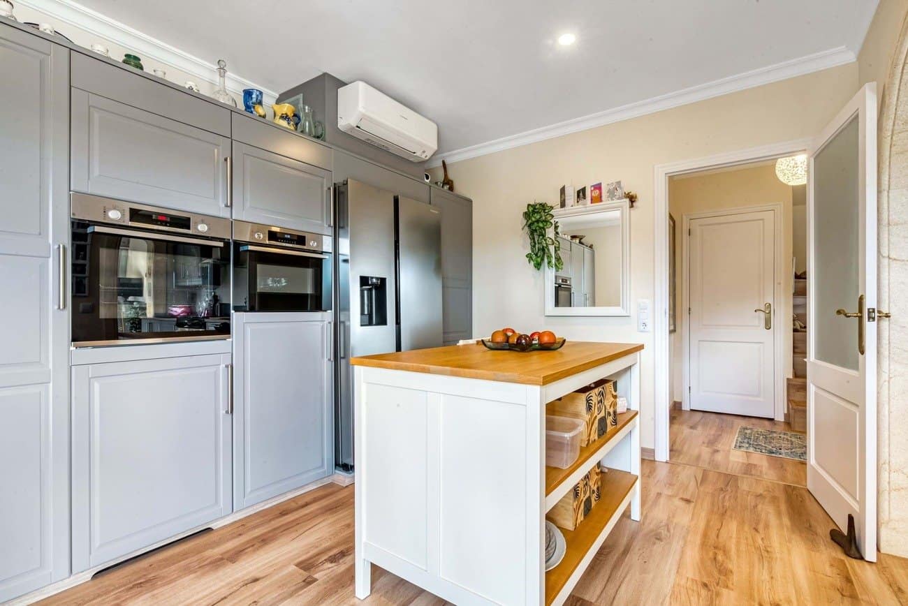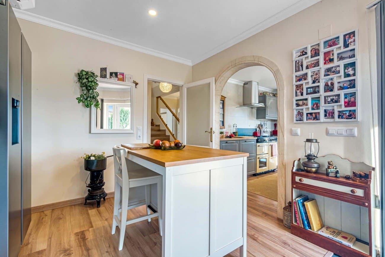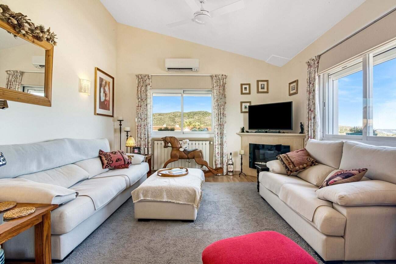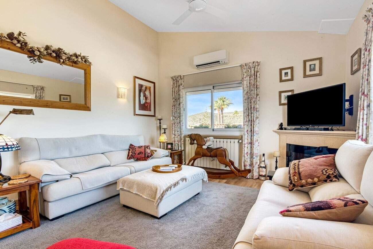 Aansluitend aan de keuken bevindt zich een kleine, dubbel beglaasde naya met plafondventilator, die toegang geeft tot een halfrond balkon, ideaal om van het uitzicht te genieten. De lichte en ruime woonkamer van circa 4 x 7 meter beschikt over een tosca stenen open haard, momenteel voorzien van een elektrische kachel maar eenvoudig om te bouwen tot houtgestookt, twee plafondventilatoren, airconditioning en openslaande deuren naar het balkon. De lift naar de benedenverdieping is discreet geïntegreerd in de ruimte.