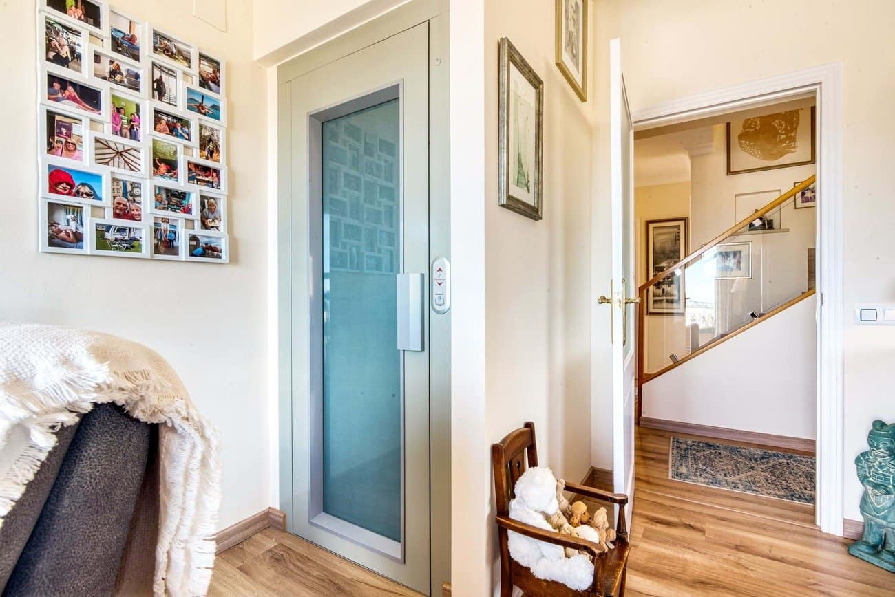 De villa is verdeeld over drie niveaus. Een interne lift verbindt de begane grond met de hoofdverdieping, terwijl een interne trap de hoofdverdieping met de bovenverdieping verbindt. Daarnaast zijn er buitentrappen aanwezig. De woning beschikt over directe toegang vanaf straatniveau en een ruime dubbele garage, wat zorgt voor een comfortabele en praktische entree.