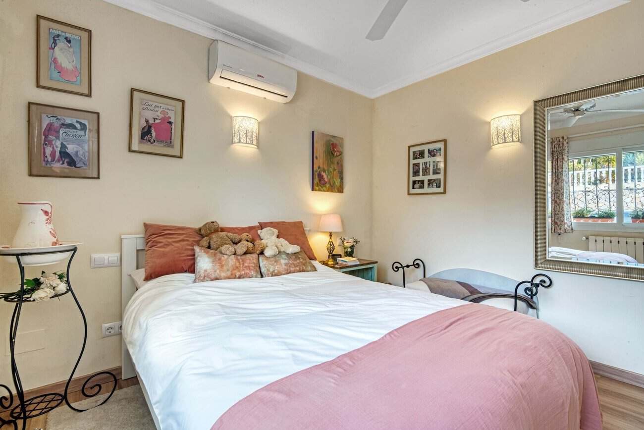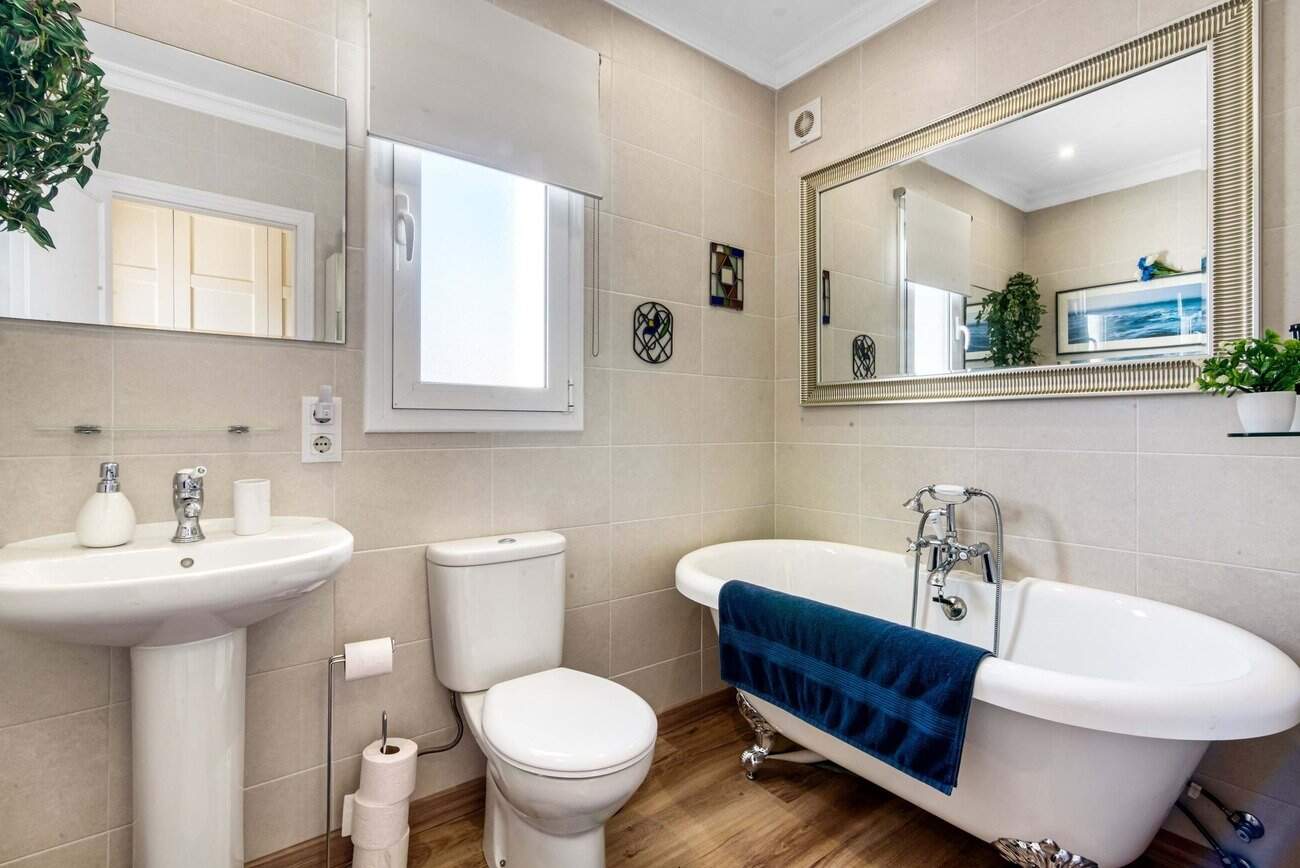 Op de bovenverdieping bevindt zich een extra slaapkamer met inbouwkast en airconditioning, evenals een gerenoveerde badkamer met een karakteristiek vrijstaand bad in vintage stijl.