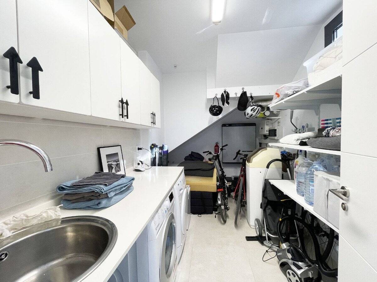 The villa has a built area of 174 m² and a practical layout. It features a bright living room with an open-plan kitchen, 2 bedrooms and 2 bathrooms. There is also a separate laundry room and a storage room.