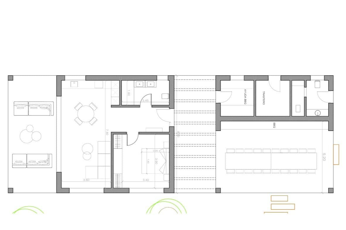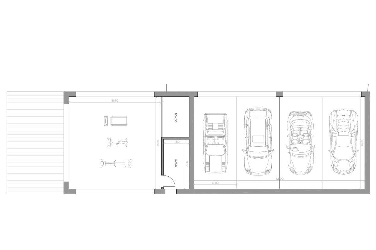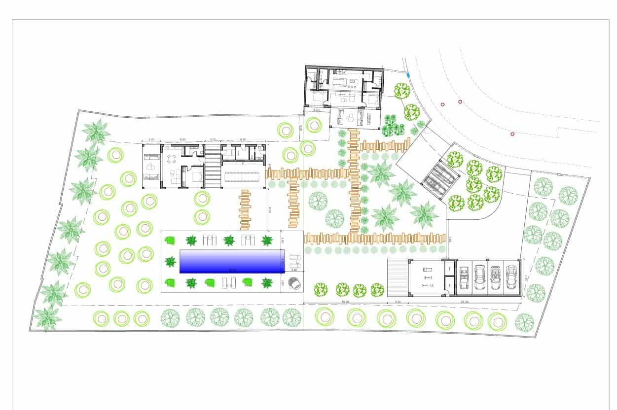 La parcela de 4.000 m² se ajardinará como un jardín mediterráneo de estilo rural, con una piscina amplia y diferentes rincones para relajarse. La orientación sur aporta sol durante todo el día. El aparcamiento se resuelve con un garaje para tres coches.