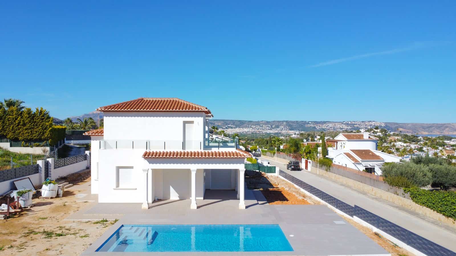 La parcela es de aproximadamente 1.000 m² y es llana. Desde el salón hay acceso directo a una amplia terraza de piscina. El dormitorio principal también tiene acceso a una terraza privada. Varias terrazas disfrutan de vistas al mar. Hay una gran piscina y espacio de aparcamiento para dos coches.