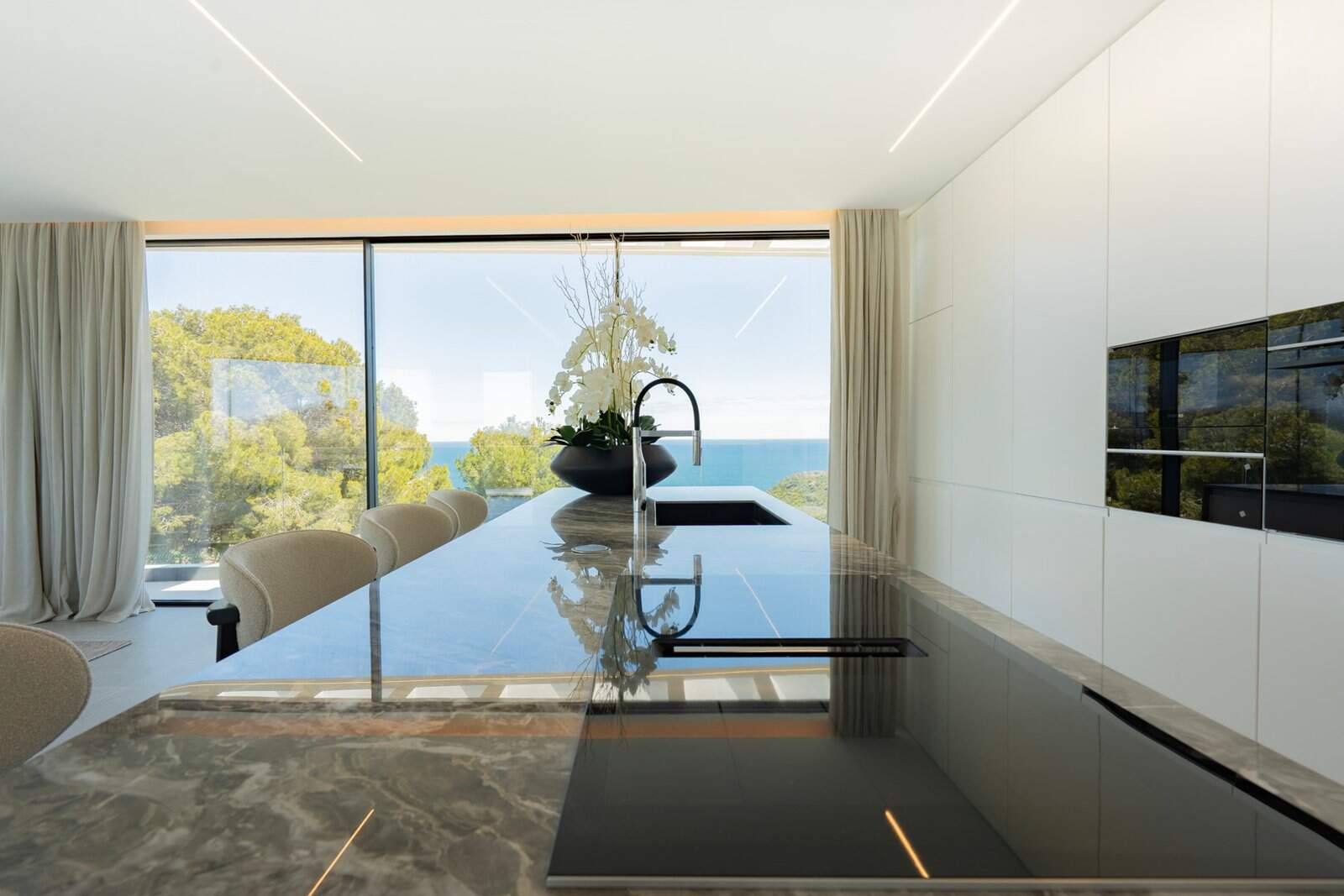 Met 4 slaapkamers en 5 badkamers, een lift, een uitgebreide domotica-installatie en een zwembad met panoramisch zeezicht op Portichol biedt deze villa in Javea een uitzonderlijke combinatie van design, comfort en ligging op de kliffen.