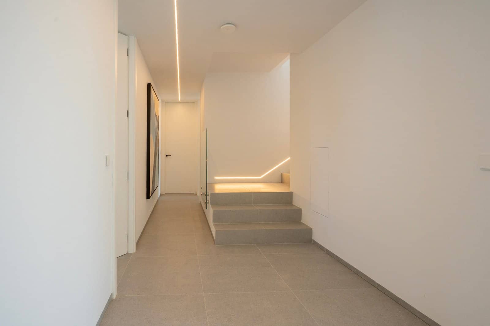 The villa has a built area of approximately 500 m² and features a spectacular contemporary design over two floors, complemented by a basement level. On the upper floor there is a living room with a designer kitchen and a generous central island. This level also includes a double bedroom with an en-suite bathroom with bathtub and walk-in shower, plus a very large dressing room. A utility room and a guest toilet complete this floor.