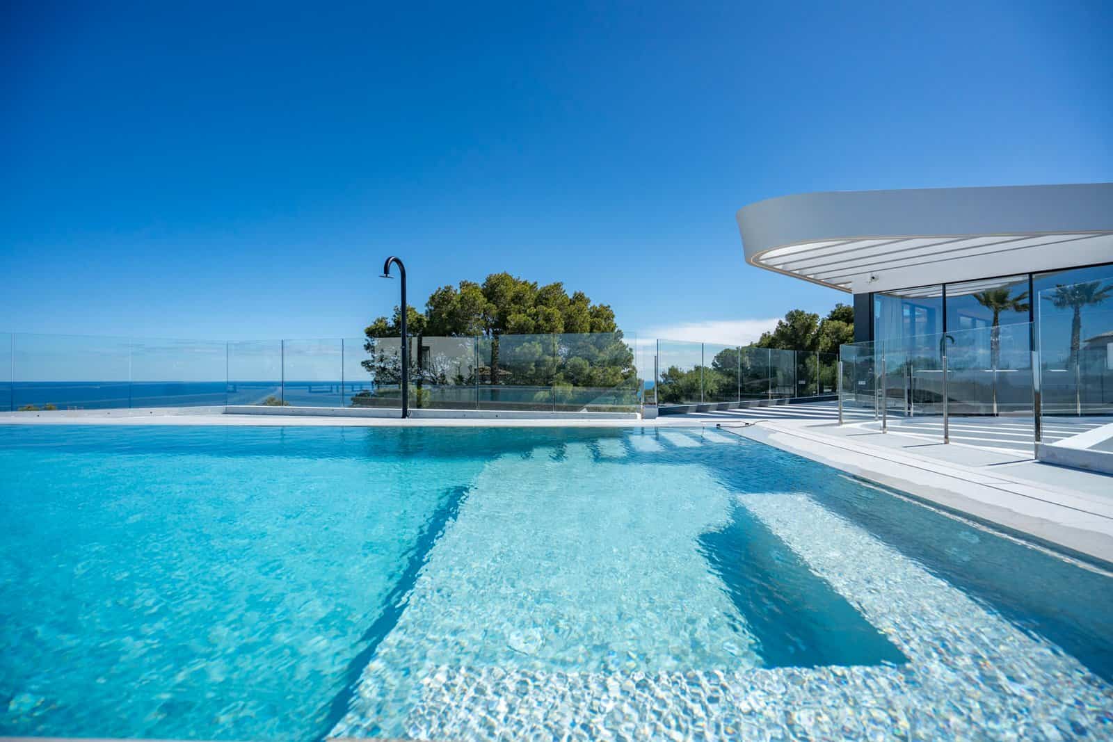 With 4 bedrooms and 5 bathrooms, a lift, extensive home automation and a pool with panoramic views over Portichol, this villa in Javea offers an exceptional combination of design, comfort and a cliff-top setting.