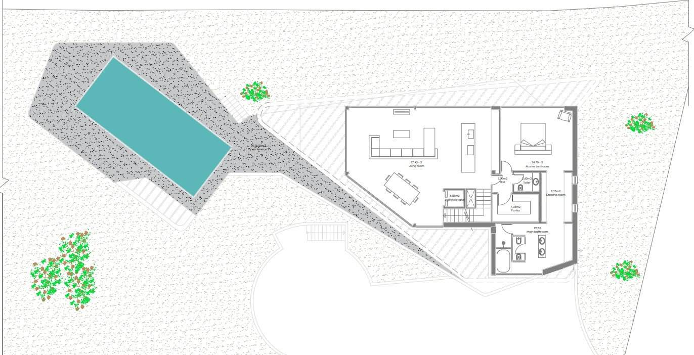 De villa heeft een bebouwde oppervlakte van circa 500 m² en is ontworpen met een spectaculair, modern design verdeeld over twee verdiepingen, aangevuld met een kelderverdieping. Op de eerste verdieping bevindt zich de woonkamer met een designer keuken met ruim kookeiland. Verder is er een tweepersoonsslaapkamer met en suite badkamer met badkuip en inloopdouche, plus een zeer grote dressing. Op deze verdieping zijn ook een bijkeuken en een gastentoilet.