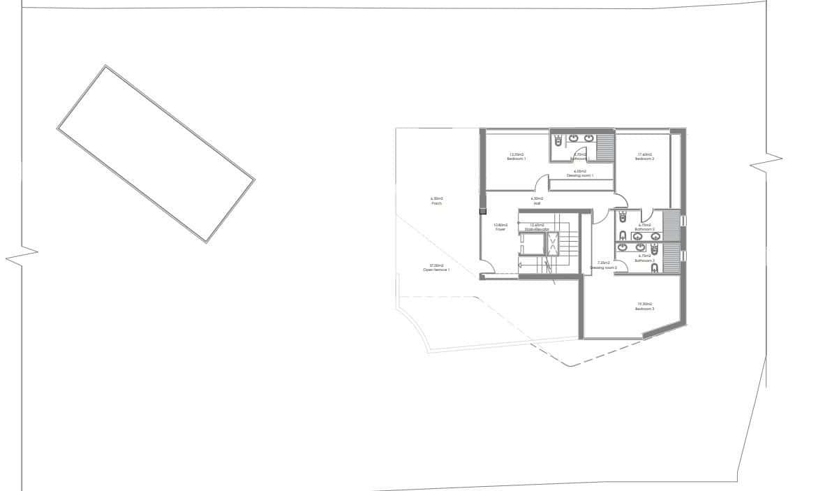 Die Villa hat eine bebaute Fläche von circa 500 m² und überzeugt mit einem spektakulären, modernen Design auf zwei Etagen, ergänzt durch ein Kellergeschoss. Auf der oberen Etage befindet sich der Wohnbereich mit einer Designer-Küche und großzügiger Kochinsel. Außerdem gibt es ein Doppelschlafzimmer mit Bad en suite mit Badewanne und begehbarer Dusche sowie einen sehr großen Ankleideraum. Ein Hauswirtschaftsraum und ein Gäste-WC runden diese Etage ab.