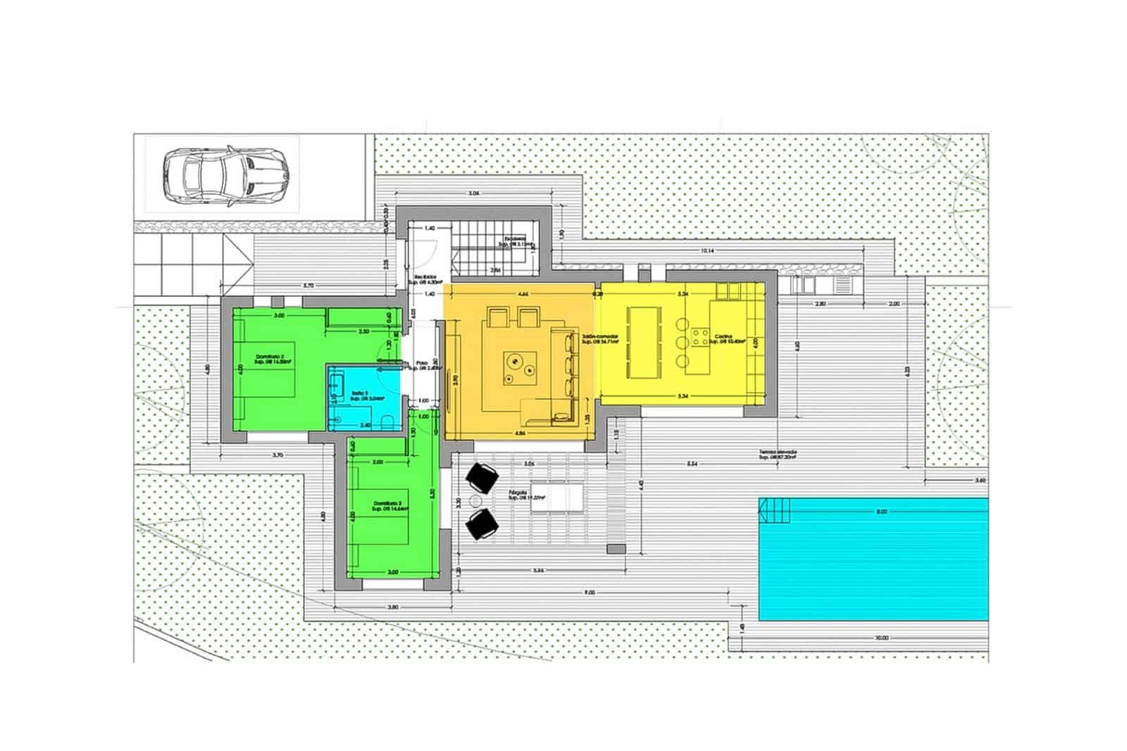 En el exterior hay una impresionante terraza de 87 m² y una piscina de 32 m². La parcela está completamente vallada, aportando privacidad. El acceso se realiza mediante una puerta para vehículos y una entrada peatonal independiente.