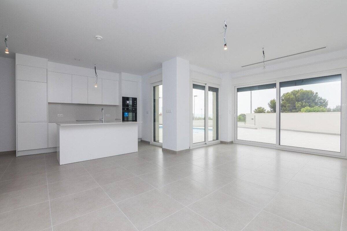 Die Villa verfügt über eine bebaute Fläche von circa 106 m² und ist komplett ebenerdig angelegt. Der Wohnbereich ist hell und großzügig, mit großen Fensterflächen und direktem Zugang nach draußen. Die offene Küche ist mit dem Wohnzimmer verbunden und sorgt für eine moderne, praktische Raumaufteilung. Es gibt 3 Schlafzimmer mit maßgefertigten Einbauschränken sowie 2 Badezimmer, eines davon en suite.