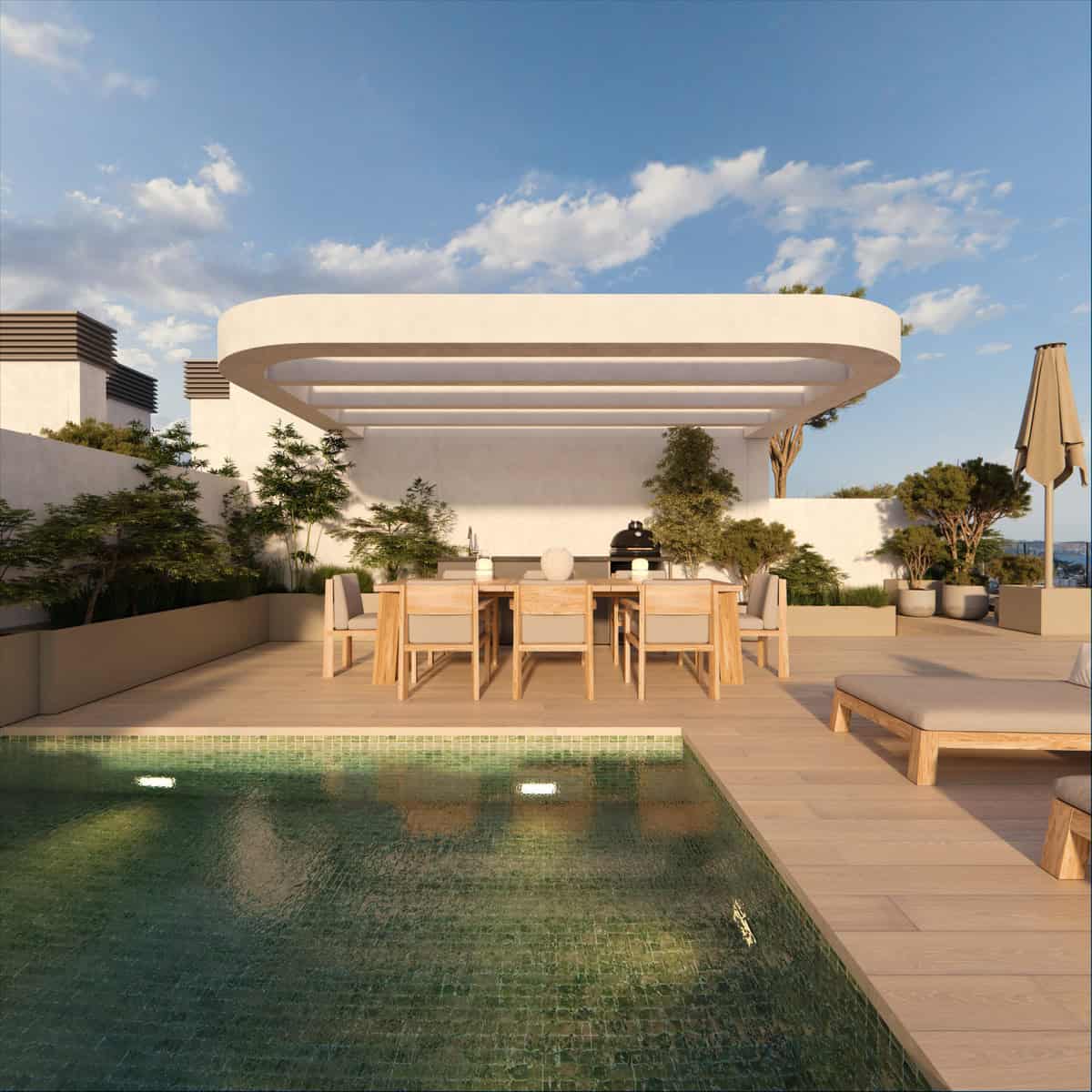 Die Gemeinschaftsbereiche bieten u. a. Pools für Erwachsene und Kinder mit Schwimmbahn, einen großen Kinderspielbereich, einen Padel-Tennisplatz, einen voll ausgestatteten Fitnessraum sowie sehr gute Fahrradabstellmöglichkeiten. Die Terrassen unterstreichen das mediterrane Wohnen in Calpe.