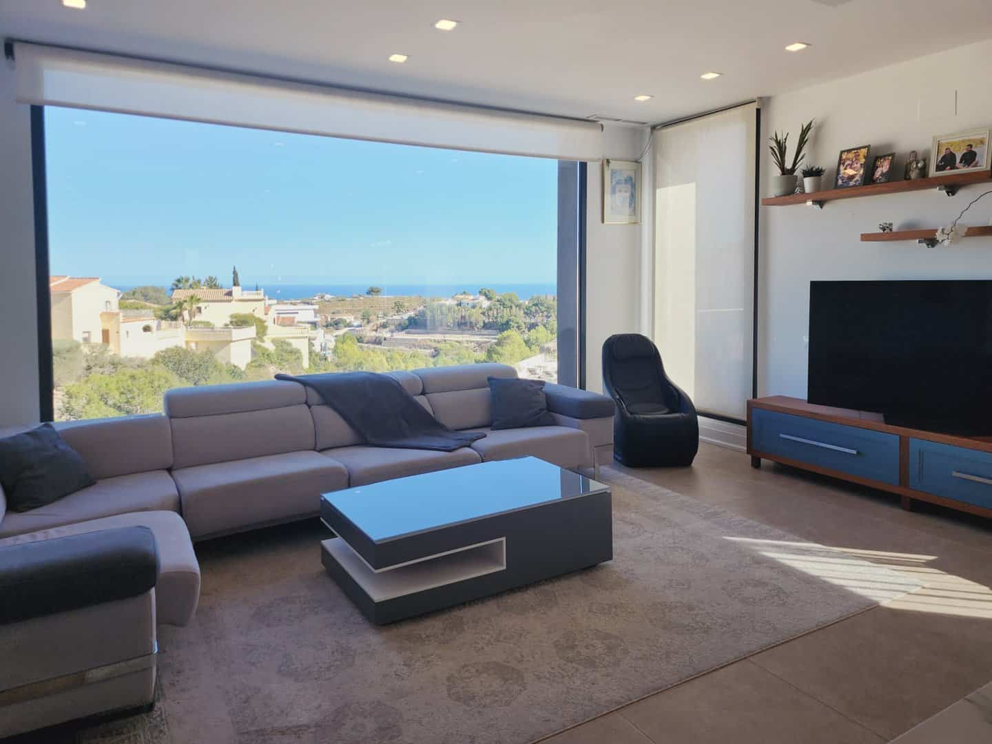 Über ein automatisches Tor gelangt man auf das Grundstück, mit Stellplatz für ein Auto und ein Motorrad. Einige Stufen führen zum Eingang. Im Inneren empfängt eine Diele mit Einbauschränken sowie ein Gäste-WC. Der nach Süden ausgerichtete Wohn- und Essbereich mit offener Küche verfügt über große Fensterflächen, viel Tageslicht und Meerblick. Die Küche ist mit Kochinsel ausgestattet, mit besonderen Materialien aus Kanada und MIELE-Elektrogeräten.