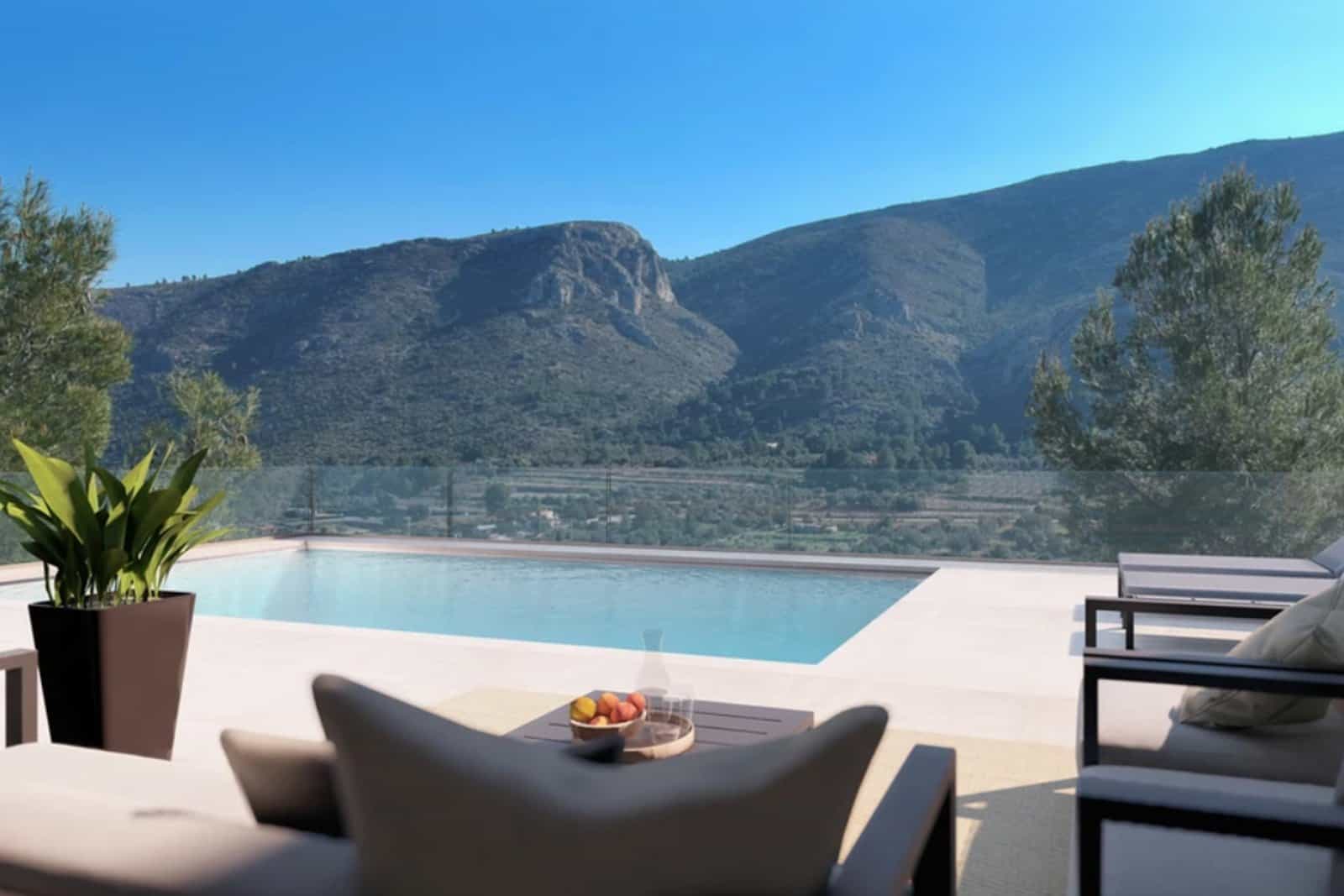 This modern design villa is located in the Solana II development in Pedreguer Monte Solana and enjoys a south-facing orientation with panoramic mountain views.