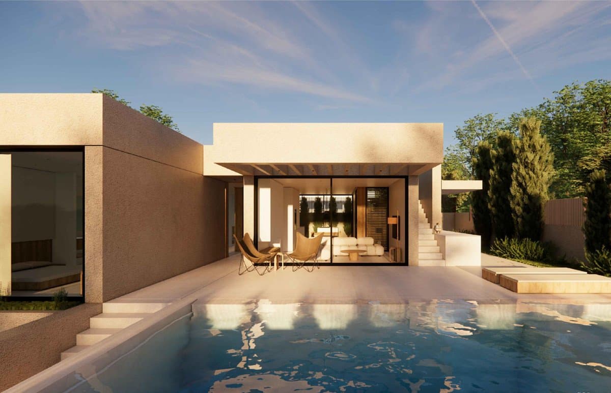 La parcela es de circa 400 m² e incluye un jardín de estilo mediterráneo con riego automático. Desde la zona de día se accede a una terraza con pérgola y a una piscina privada de agua salada.