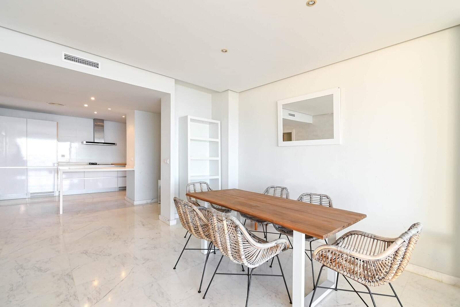 El ático está pensado para un estilo de vida cómodo, con una zona de día de concepto abierto donde el amplio salón y la cocina de diseño se integran de forma fluida. Los grandes ventanales aportan luminosidad y mantienen las vistas al mar como protagonista.