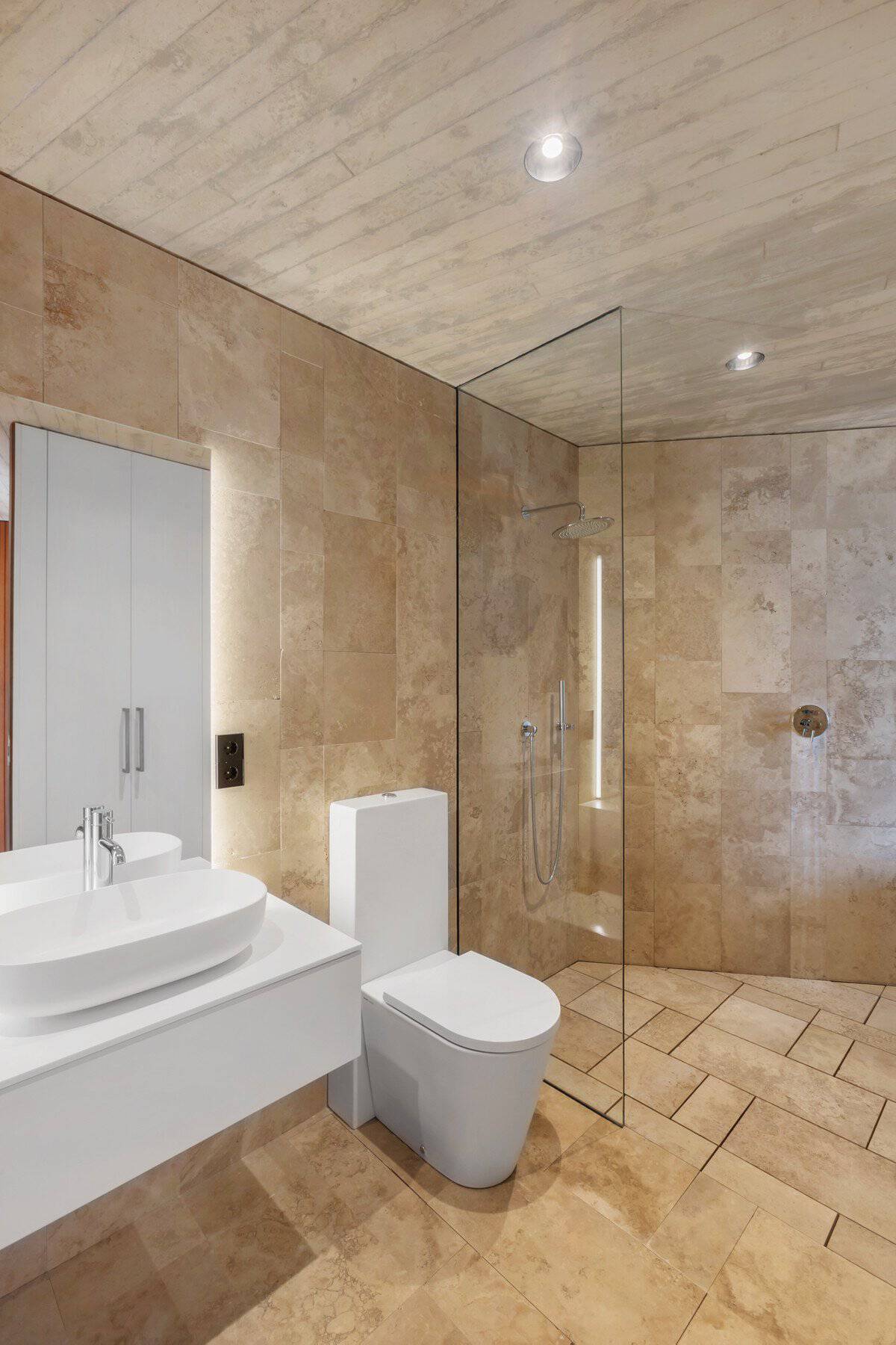 Das Konzept ist modern und minimalistisch, geprägt von klaren Linien sowie der Kombination aus Beton und Naturstein. Großzügige Verglasungen rücken den Meerblick in nahezu jedem Raum in den Mittelpunkt. Die Küche ist mit einer zentralen Kochinsel ausgestattet. In den Bädern ist unter anderem eine freistehende Badewanne vorhanden.
