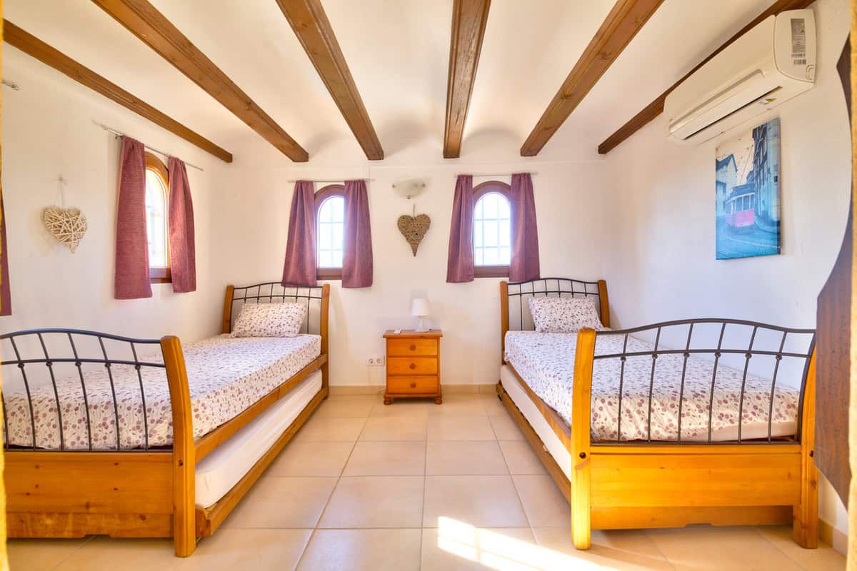 Die Villa bietet 4 Schlafzimmer und 2 Badezimmer. Im Obergeschoss liegt das charakteristische „Turmzimmer“ mit zwei Einzelbetten. Vom Wohnzimmer führt ein Flur zu den weiteren drei Schlafzimmern und zum Familienbad. Das Hauptschlafzimmer verfügt über ein eigenes Duschbad mit begehbarer Dusche.