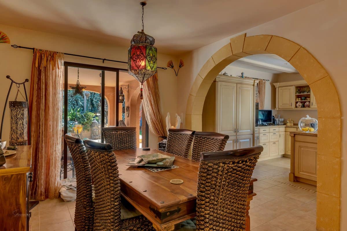 The plot is circa 800 m² and is designed for outdoor living. It features a private swimming pool with surrounding terraces, a covered naya, pergola, BBQ area and a jacuzzi. Parking is available under a carport with a retractable awning, with additional off-road parking on the property.